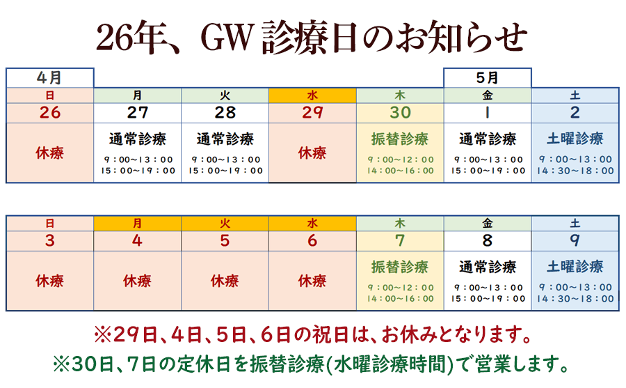 午前診療:9:00〜12:50 / 午後診療:14:30〜18:00